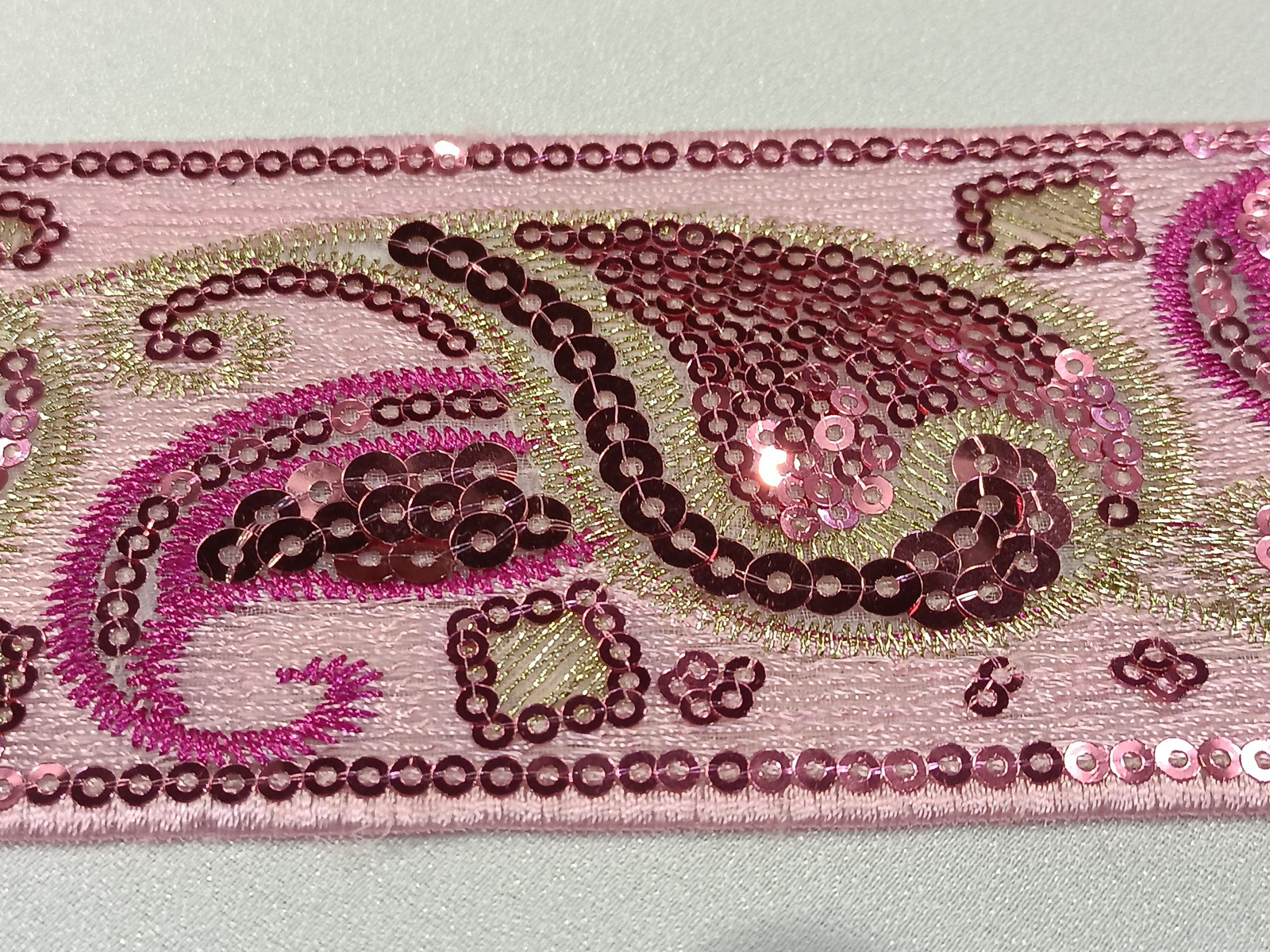 - Cenefa bordada en lentejuelas en hilo de colores en tonalidades rosas y fucxias con diseño bordado en cachemire sobre el que contiene lentejuelas verdes rosas sobre la superficie.Es un tipo de artículo llamativo de muy buen acabado para tejidos de fiestas.