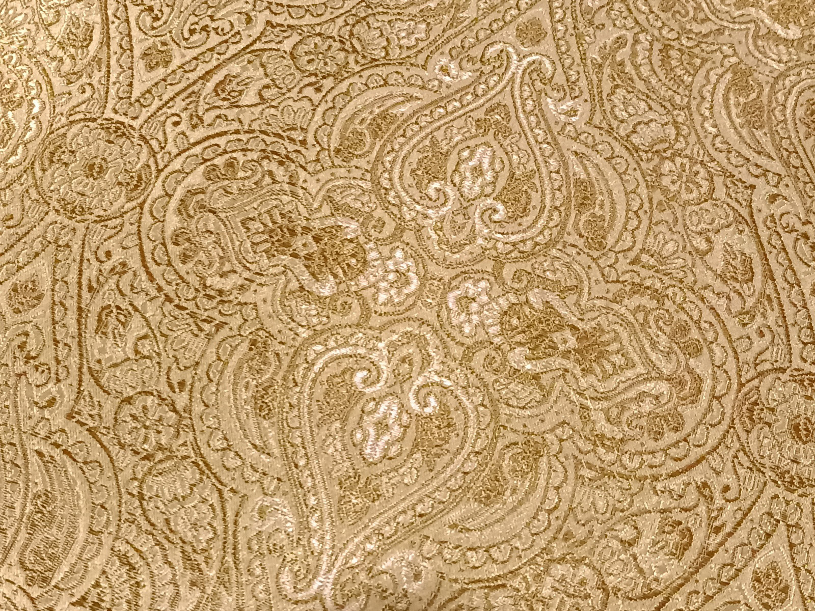 Tejido brocado de tipo raso bordado, de gran tacto y textura con un diseño en tipo morisco en fondo de negro con bordado en oro.Tejido blando para confección de cualquier prenda como trajes medievales ,Fiestas de Moros y Cristianos,compañías de teatro, etc..