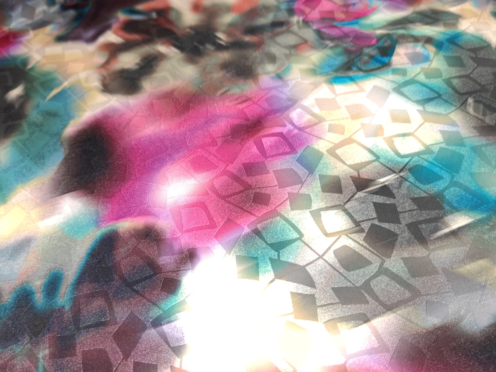 Tejido de piel de angel estampado con diseño abstracto metálico con combinación de colores en tonos fucxias, negros, verdes y turquesas.