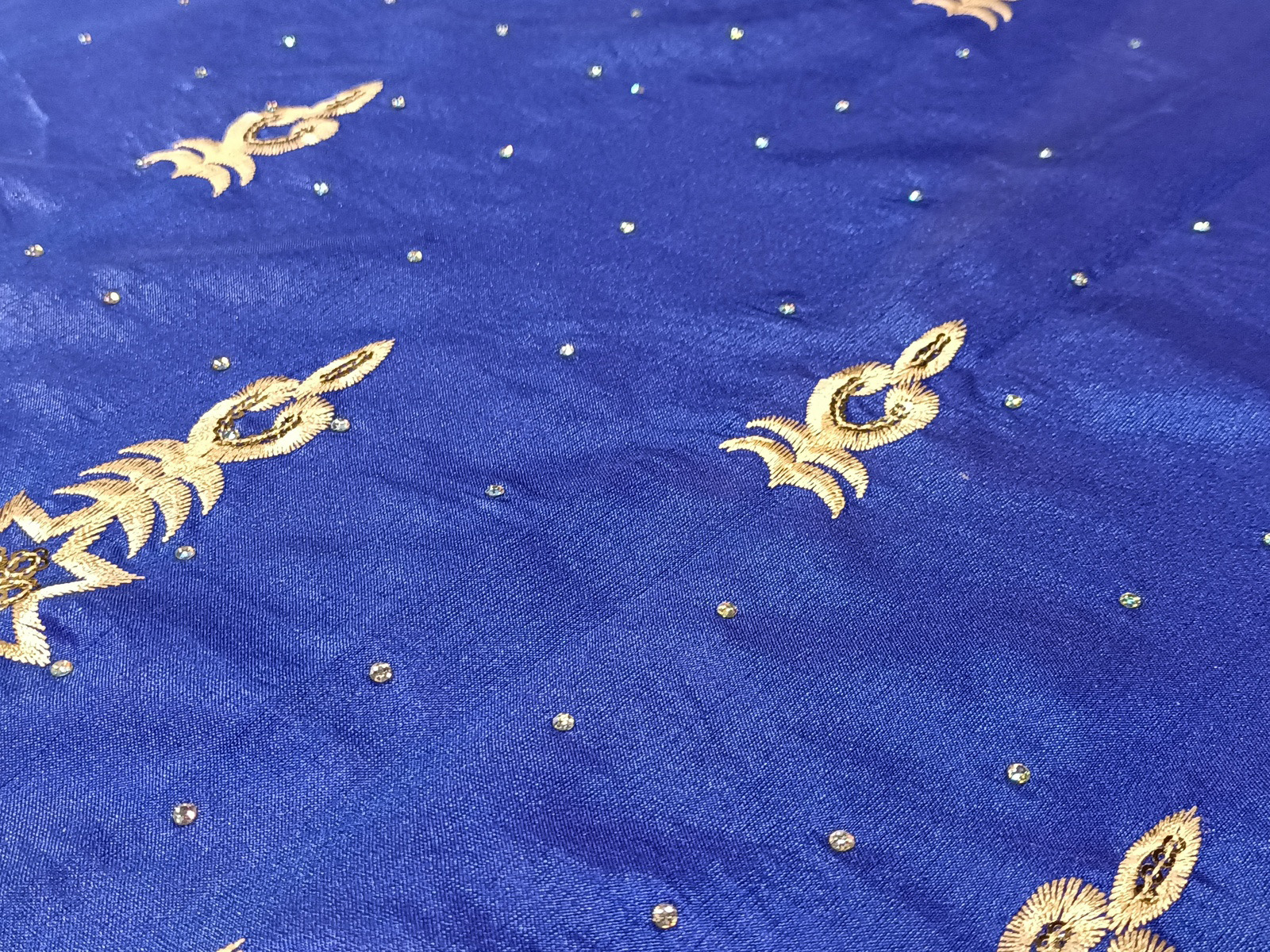 Tejido de Shantung bordado con cenefa bordada en uno de sus extremos en hilo color oro y fúcxia con detalles de bordados etnicos en el resto del tejido,incluye piedras en efecto cristal por todo el tejido.