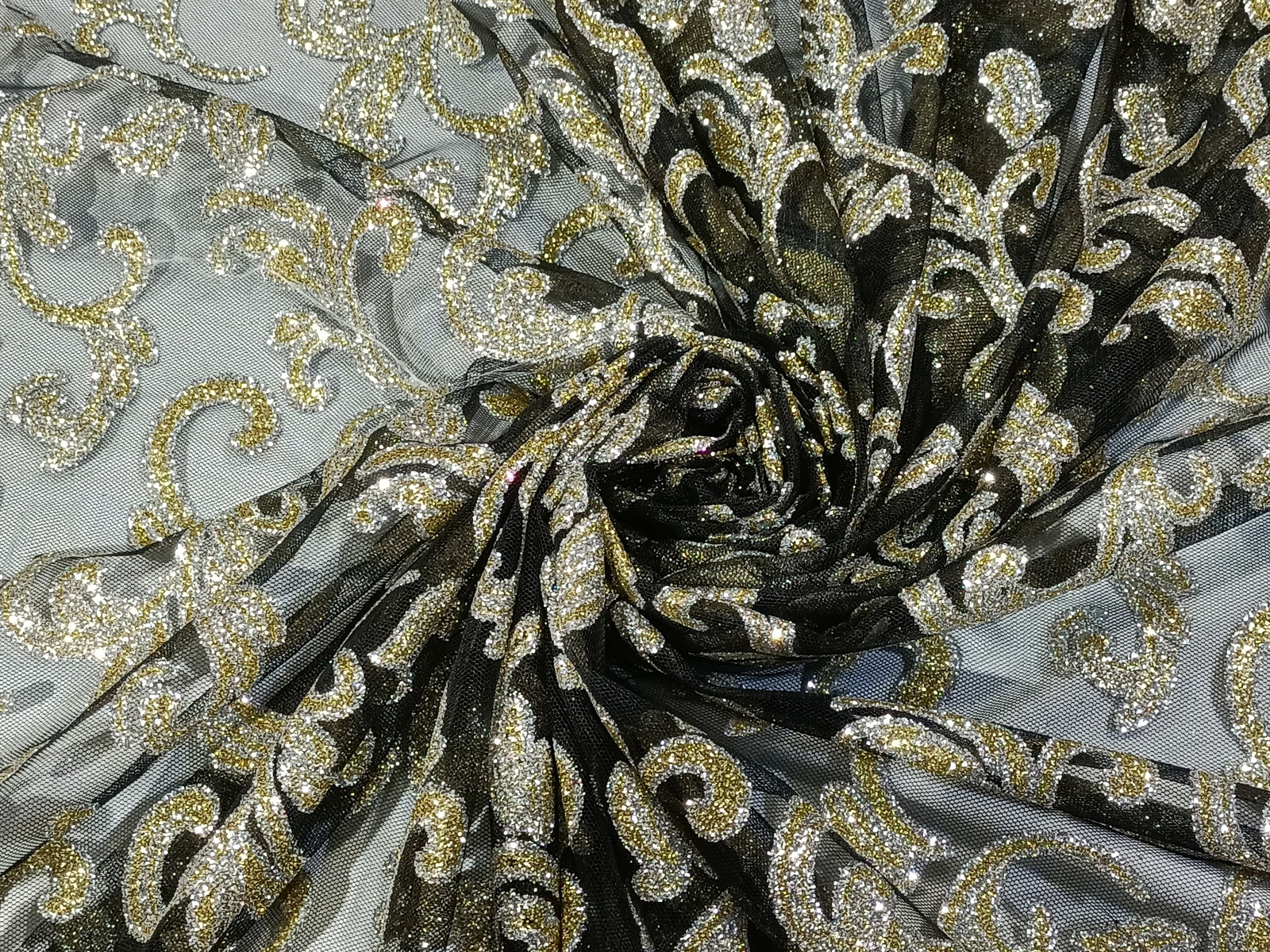 Tejido de tul negro de calidad semirigido con figuras florales en escarcha en oro brillo canteado en plata.Tejido muy utilizado para eventos festivos, disfraces, capas de Reinas de fiestas..etc.